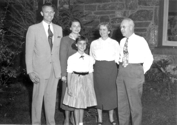 (f0879.jpg) Doc, Helen, and Diane, Decatur, Charlotte and Clem Evans, October 1953