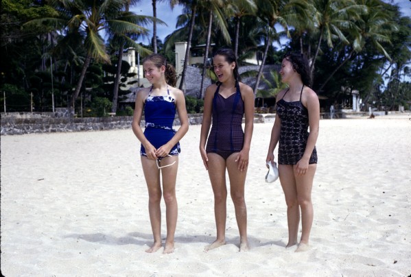 (c0082-xe17.jpg) June and Caroline and a friend on the beach in Hawaii.